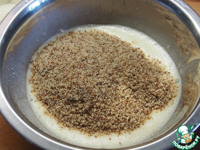 В полученную массу добавить молотые орехи и муку, перемешать. Вместо лесных орехов можно использовать миндальные, в этом случае используйте обычный белый сахар и вместо рома лучше добавить ванильный сахар, но вкус, естественно, будет совсем другой.