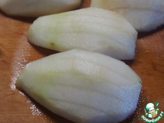 На выпуклой стороне четвертинок груш острым ножом сделать несколько надрезов, не прорезая насквозь.