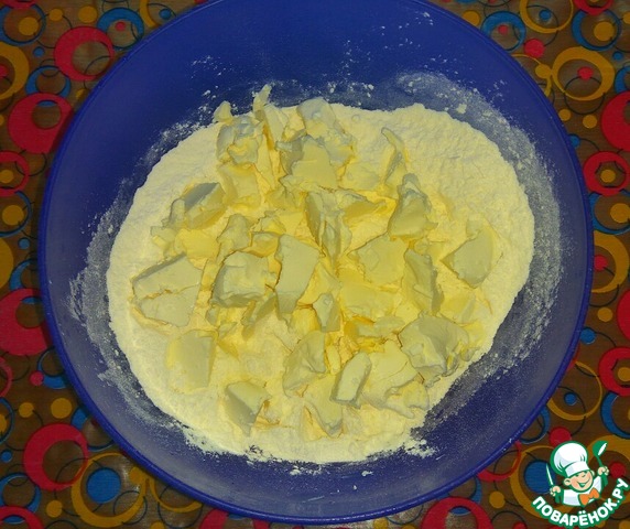 Муку смешать с разрыхлителем. Добавить холодное масло, нарезанное кусочками. Перетереть руками в крошку.