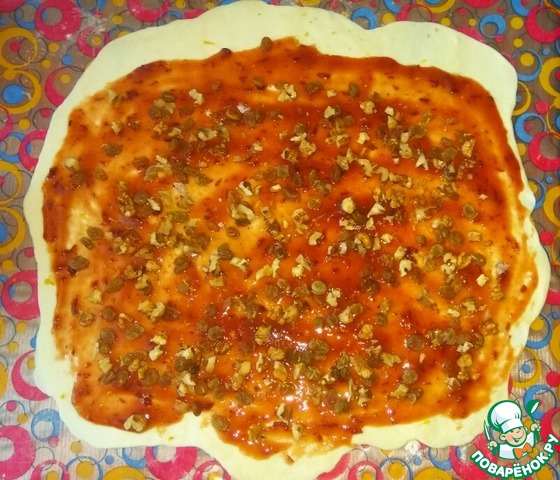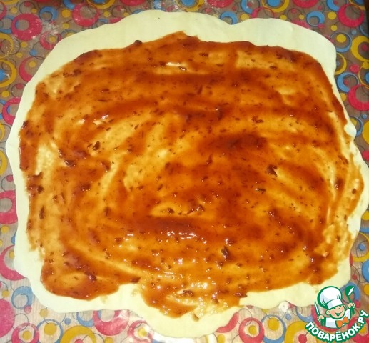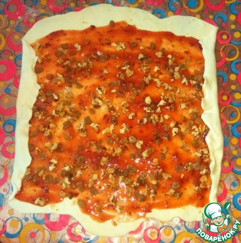 Около 1,5 см длинного края не смазывать вареньем. Чтоб при выпечке оно не вытекало через шов. -