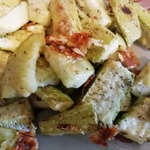 Посыпаем кабачки солью, паприкой, сухим молотым чесноком (свежий не подойдет) и добавляем немного измельченной зелени. Еще раз перемешиваем и выкладываем на противень или решетку для духовки.