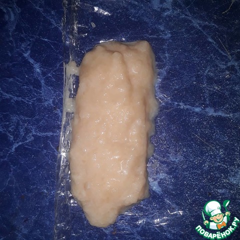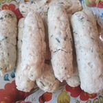 • Выложить фарш на пищевую плёнку и скрутить в форму сосисок (я сделала 8 штук), закрутить края и завязать (я проверила 4 разных варианта: маленькими резинками, проволокой, железным шнуром и ниткой; все оказались хорошими);