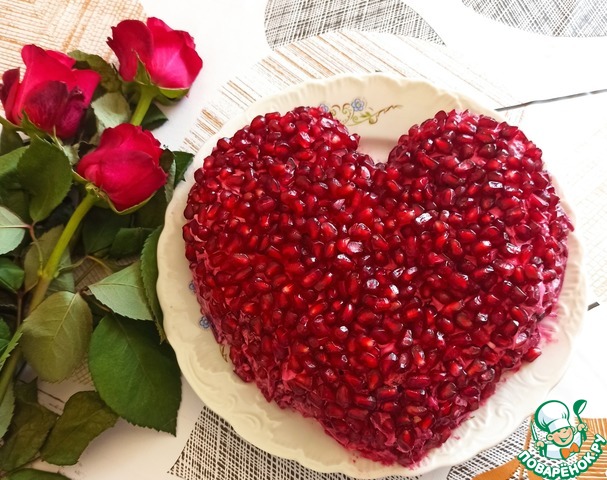 Браслет, но не гранатовый. Салат "Гранатовый браслет" своим видом вызывал у меня аппетит, НО Очень не люблю в салатах гранаты... Вот решила я оставить форму Браслета, остальное - по своему вкусу.. Гости были в восторге!!!