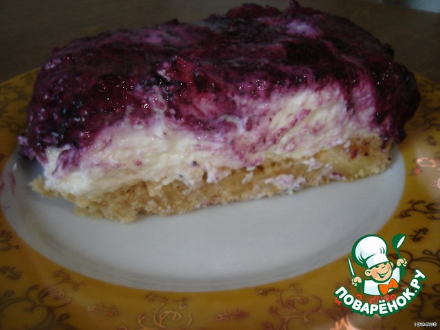 аккуратно черничную начинку развести по поверхности торта тонким предметом, придав мраморность за счёт смешения творожного и черничного цветов