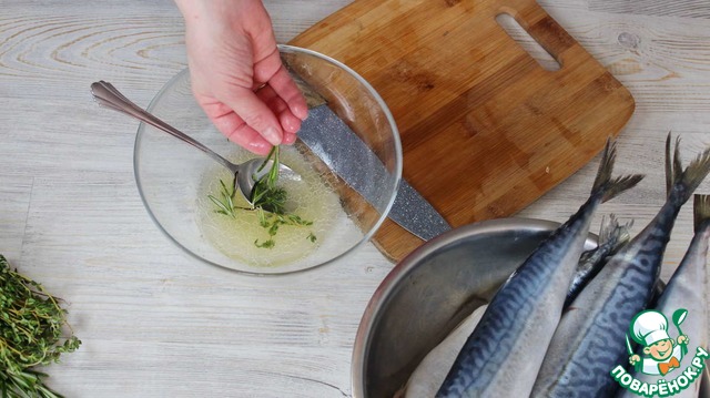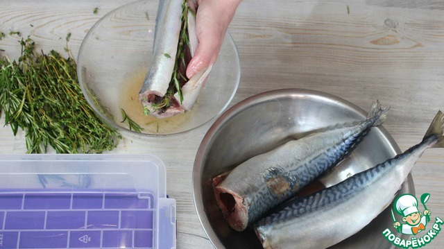 Рыбу обильно поливаем маринадом, смазываем внутри, оставшиеся веточки тимьяна и розмарина вкладываем внутрь рыбы, можно положить сверху на рыбку, складываем в контейнер и оставляем мариноваться минут на 30-40.
