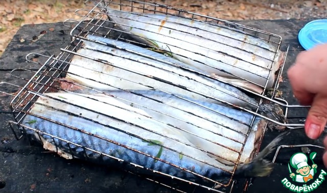 Выкладываем рыбу на решетку и жарим на углях с двух сторон до золотистой корочки. У меня ушло минут 10 с каждой стороны.