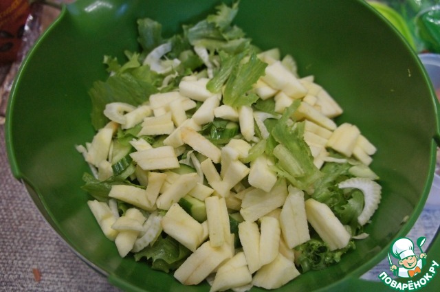 Яблоко очистить от кожицы и семенной коробочки, нарезать тонкими брусочками или ломтиками, как вам больше нравится, добавить к остальныи ингредиентам.
