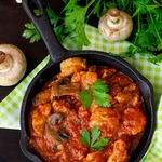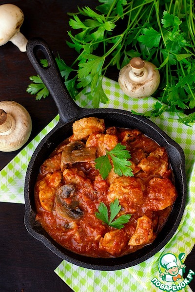 Добавить ломтики очищенных помидоров или томатный соус и тушить до мягкости мяса. Можно сделать это в духовке.