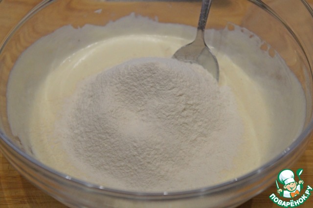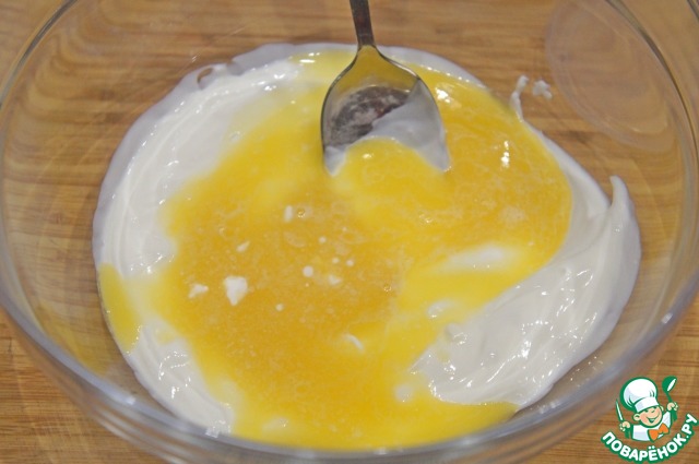 Сметану смешать с содой. В сметану добавить растопленное масло.