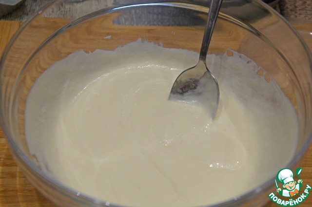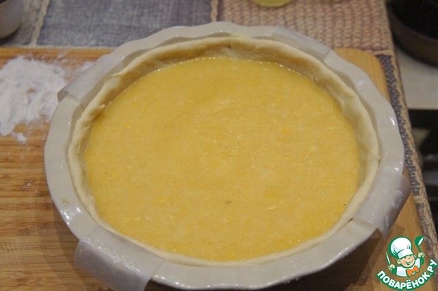Духовку нагреть до 180°C. 2/3 теста выложить в качестве основы, распределить по всей поверхности формы, сделав бортики.