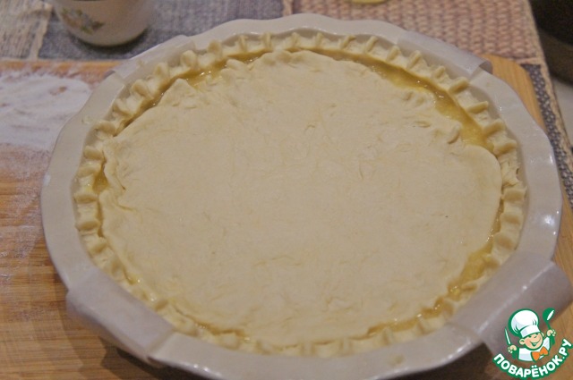 Размять вторую часть теста руками и закрыть ею начинку. Для золотистой корочки смазать пирог взбитым желтком. Многократно наколоть пирог вилкой.