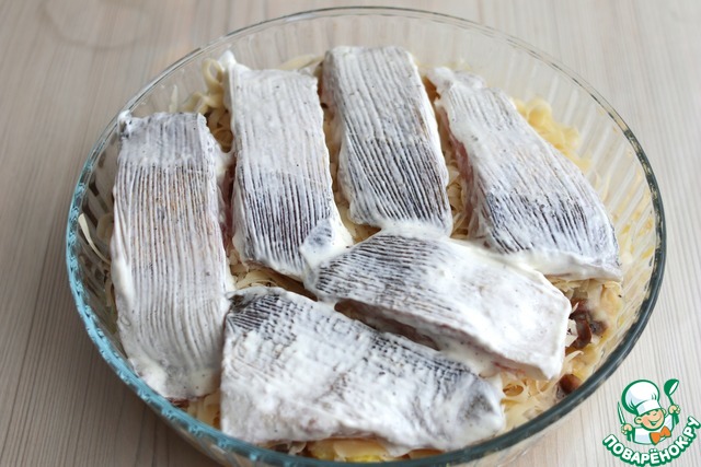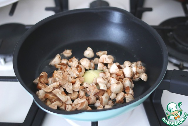 Предварительно рыбу разделать на филе, нарезать на кусочки. На сковороду добавить 2 ст. ложки топленого масла, добавить нарезанные шампиньоны (3 горстки).
