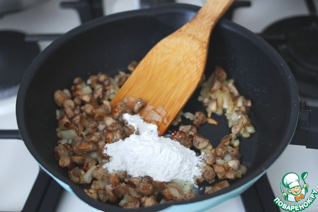 Затем добавить 1 ст. ложку муки. Смесь перемешать. Добавить примерно 1,5-2 ст. воды или рыбного бульона. Добавить черный молотый перец и соль по вкусу.
