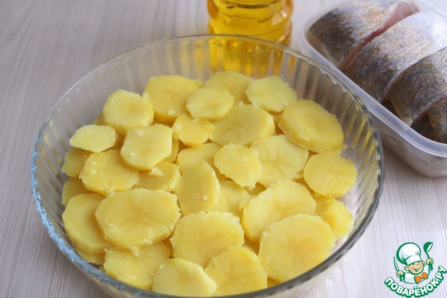 Картофель (7 шт.) отварить до состояния Al dente в подсоленной воде, остудить. Нарезать пластиками 0,5 - 0,7 мм. На дно формы для запекания добавить 2 ст. ложки растительного масла, выложить пластики картофеля.