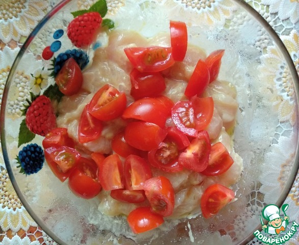 Помидоры черри помыть, разрезать на 4 части. Добавить к куриному филе, перемешать.
