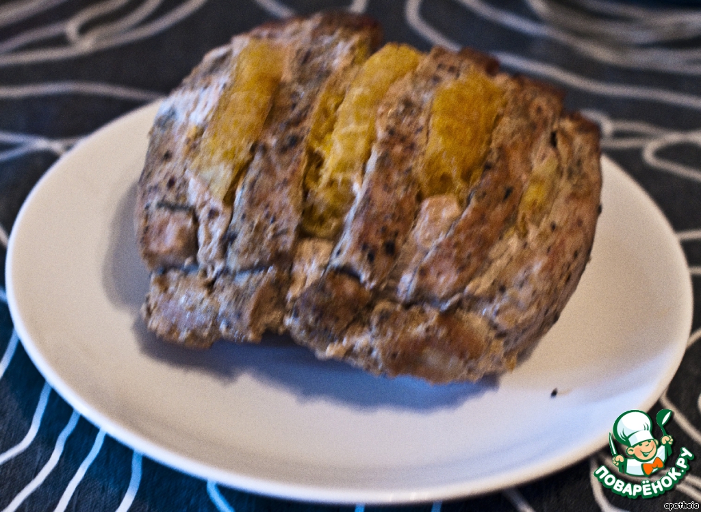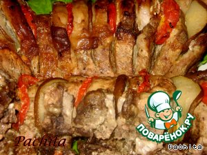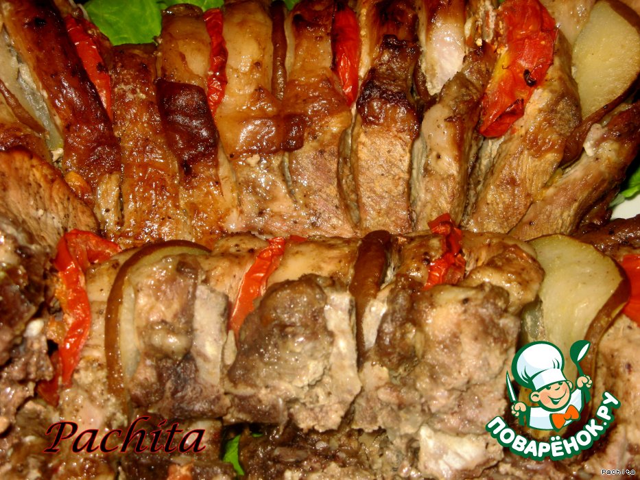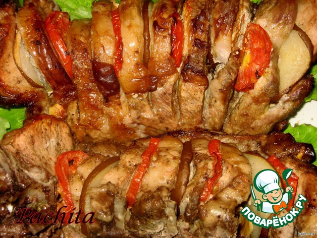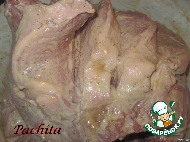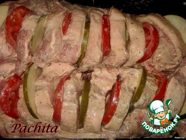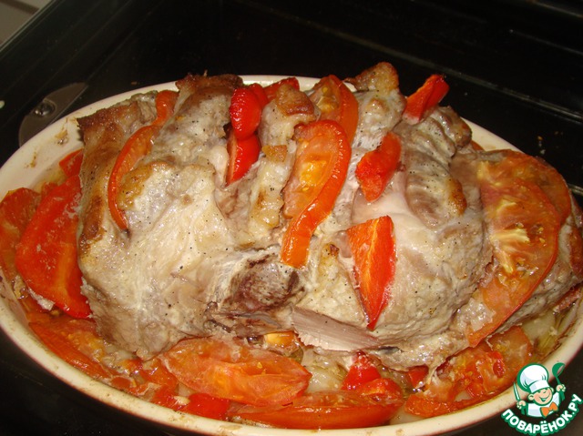 Такое название возникло из за того, что мне нравится, при приготовлении, экспериментировать с этой частью свининки. Мясцо получается всегда превосходным! Тем более маринованное в майонезно-горчичном маринаде, переслоенное грушей, помидорами и чесноком и запечeнное до золотистой корочки.