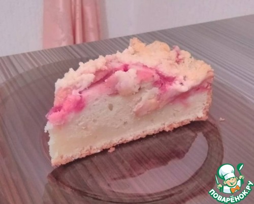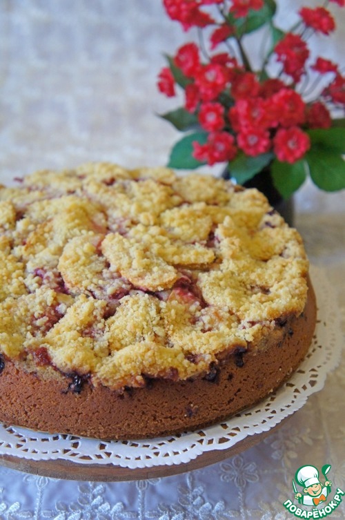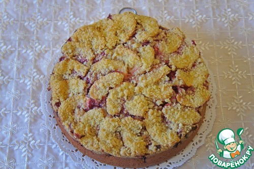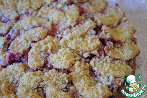 Все ингредиенты порубить ножом до крошки так, чтобы масло забрало в себя муку и сахар. Посыпать пирог рубленой крошкой.