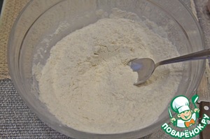 Муку просеять в отдельную миску, добавить разрыхлитель и перемешать.