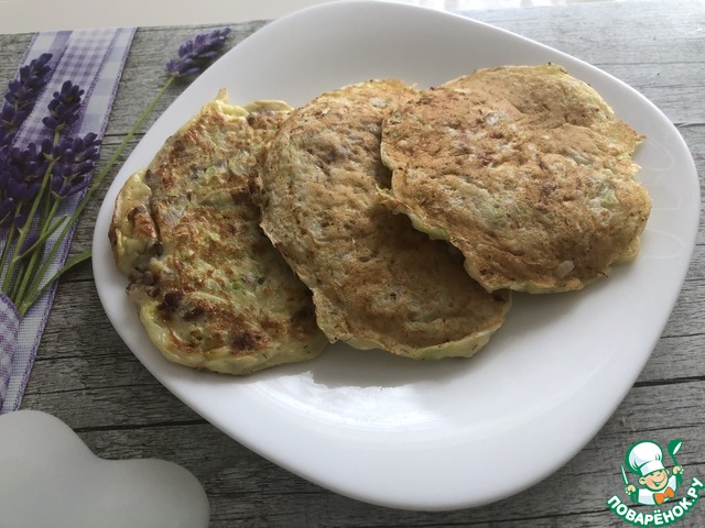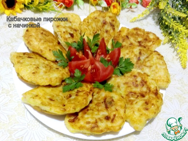На разогретую и смазанную растительным маслом сковороду ложкой выкладываем кабачковое тесто, средним, не толстым слоем и разравниваем, формируя лепешку овальной формы. Также формируем вторую лепешку. Огонь чуть ниже среднего, как только лепешка сверху «схватилась», на один край выкладываем начинку, вторым краем накрываем и прижимаем сверху, склеивая края между собой. Обжариваем «пирожок» с двух сторон под крышкой. Аналогично обжариваем все «пирожки».