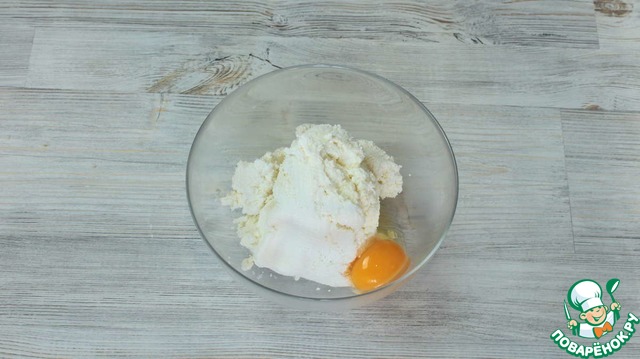 Большая часть успеха – творог. Он должен быть свежий, качественный, сухой. Творог лучше выбирать 5-9 процентов жирности. У нас в этот раз творог влажный, поэтому откидываем его на полотенце и отжимаем. Чем меньше жидкости, тем меньше муки или манки потребует тесто для сырников, а значит вкус будет насыщенней. В творог добавляем яйцо, сахар и муку.