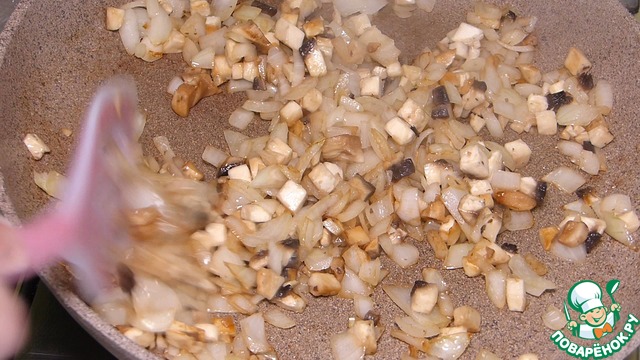 Обжариваем на сковороде в 1 ст. л. растительного масла лук, примерно 1 мин,