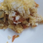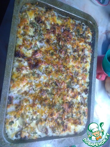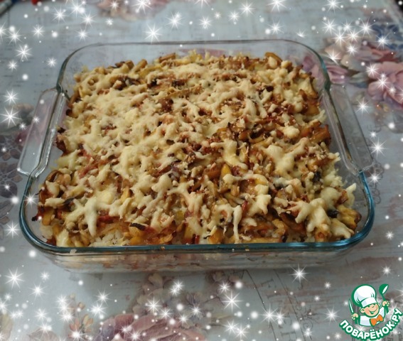 Духовку поставить разогреваться до 200 градусов. Рис, грибную массу и сыр зрительно поделить на 3 части. В форму для запекания первым слоем кладем одну часть риса, сверху одну часть грибной массы, а затем сыр. Слои повторить в том же порядке еще два раза.