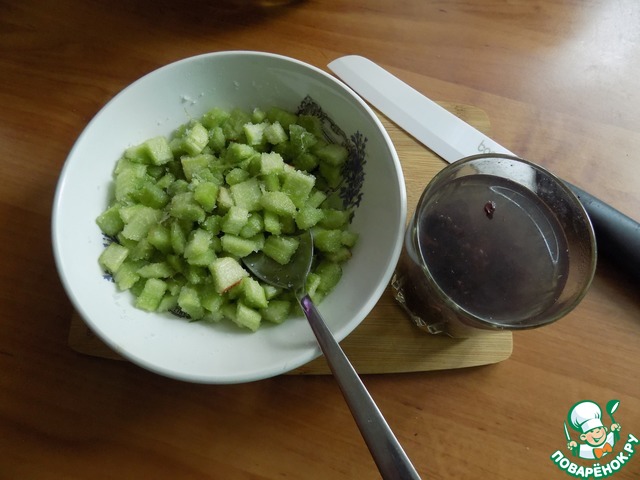 Ревень очищаем от кожицы и вот таким образом нарезаем. Помещаем в посуду.