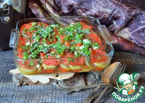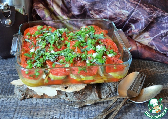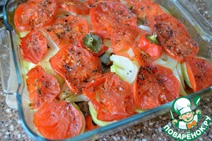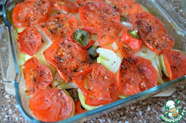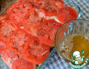 выложить кольца помидоров и лавровый лист, заправить перцем.