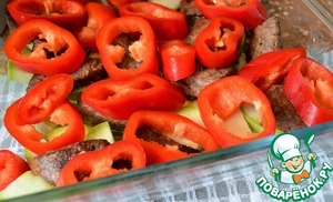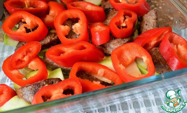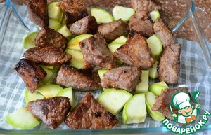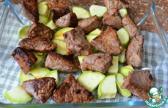В огнеупорную форму выложить часть кабачка, на него мясо.