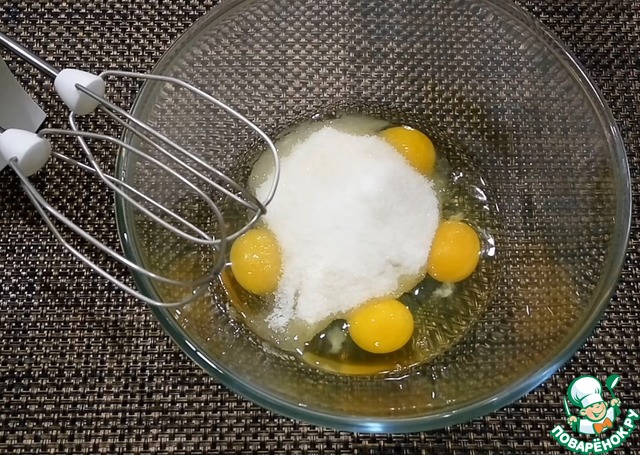 В миске взбейте яйца, сахар и ванильный сахар в пену.