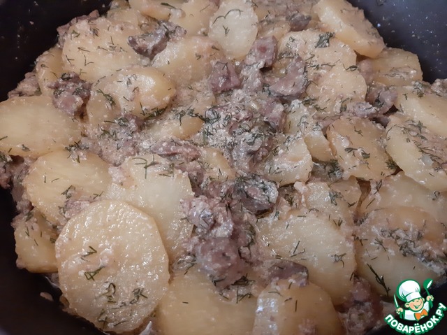 Вот только картошку я сразу перемешала с печёнкой. Не увидела смысла держать её поверх всего.