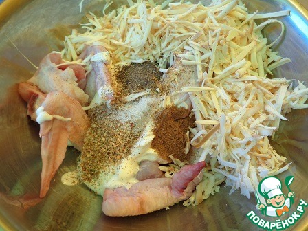 • Крылышки соединить с нашинкованным сыром, солью, перцем, специями и приправой, добавить сметану.