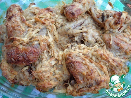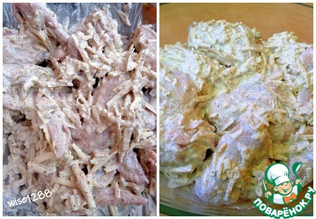 Крылышки соединить с нашинкованным сыром, солью, перцем, специями и приправой, добавить сметану.