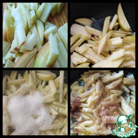Яблоки режем соломкой. На сковороде растапливаем кусочек сливочного масла и обжариваем яблоки. Добавляем 50г сахара и даём закарамелизироваться яблокам. Затем добавляем корицу и тушим до мягкости. Оставить остужаться.