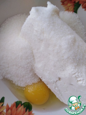 Творог смешать с сахаром и яйцами.