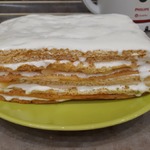 Собираем торт. На корж намазываем слой крема, укладываем сверху следующий корж. Продолжаем пока не соберём весь торт.