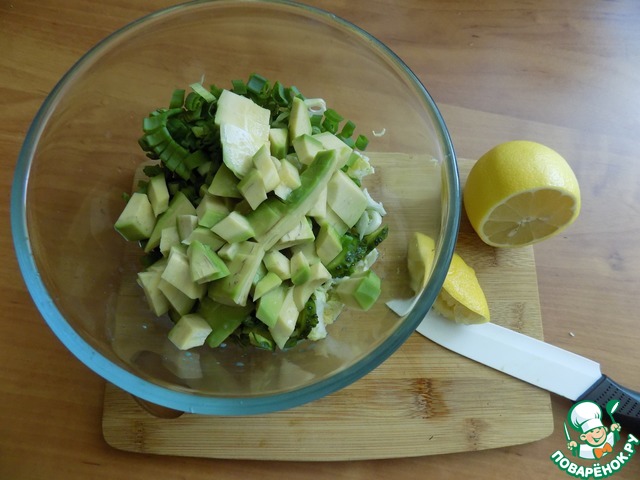 Режем авокадо небольшим кубиком. Всегда использую для этого керамический нож. От него авокадо быстро не темнеет. Впрочем, так же и яблоко. Выкладываем авокадо в салатник. От лимона отрезаем дольку и отжимаем сок прямо на авокадо. Перемешиваем.