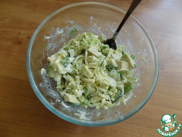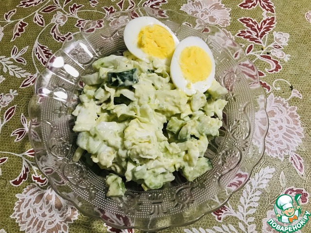 Салат с авокадо, яйцом, зелёным луком, пекинской капустой и огурцом. Салат заправлен майонезом и лимонным соком. Вместо майонеза отлично подойдёт сметана или майонез+сметана. Салат подойдёт на ужин, как самостоятельное блюдо, а так же для гостей и на праздничный стол.