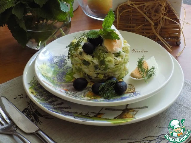 Украсила или дополнила салат веточками мелиссы, маслинами, укропом и половинками яйца, порезанных ещё пополам.