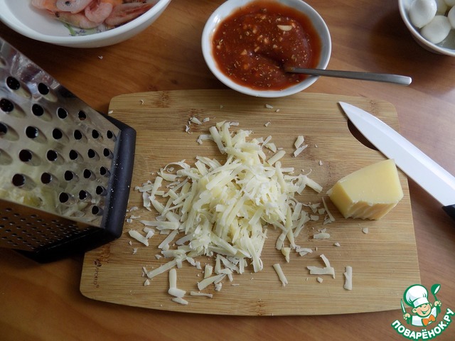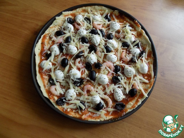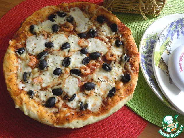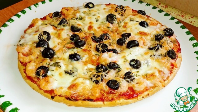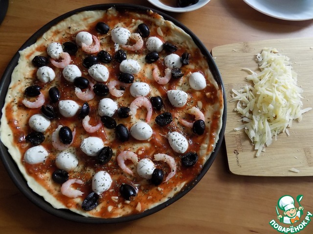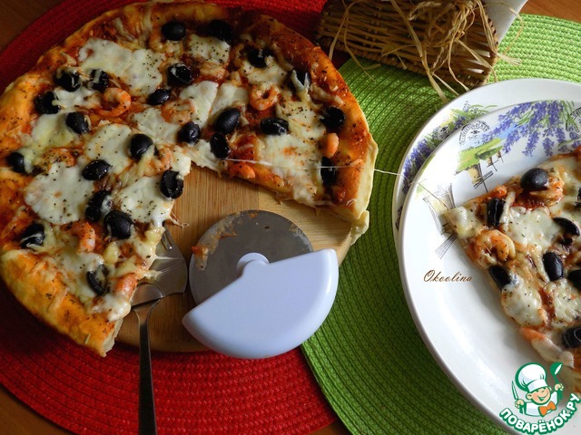 Пицца в домашних условиях на дрожжевом тесте для пиццы с креветками, моцареллой, пармезаном и маслинами.