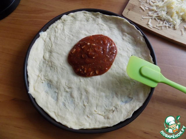 Тесто подошло и увеличилось в размере. Вынимаем его из посуды и обминаем. Работая руками, формируем тонкую лепёшку. Тесто очень эластичное и хорошо растягивается. Я взяла форму D-30 см. Растянула лепёшку по всей плоскости круга. Если тесто немного липнет к рукам, можно из смазать маслом. Выкладываем на тесто соус и промазываем всю поверхность им, используя опять же силиконовую лопатку (ей очень удобно работать!).