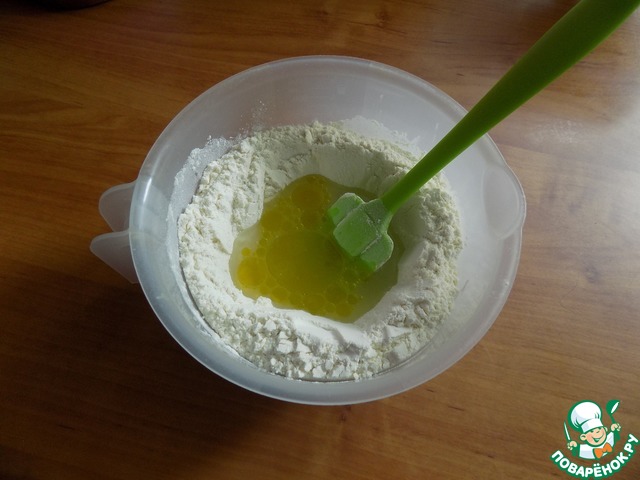 Делаем углубление в муке и наливаем тёплую воду. Добавляем оливковое масло. Я всегда добавляю только оливковое! Сначала замешиваем тесто, используя силиконовую лопатку, затем работаем руками. Тесто к рукам не пристаёт, мягкое и податливое.