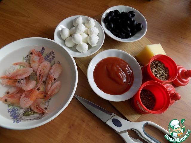 На соус кладём шарики моцареллы, разрезанные пополам и между ними - креветки очищенные и обсушенные бумажным полотенцем. Маслины тоже режем пополам и укладываем тоже по всей поверхности. Присыпаем сухим базиликом, если нет свежего.