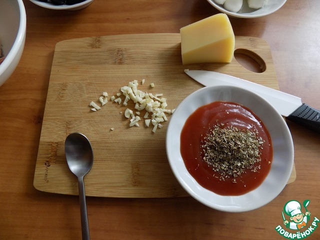 Делаем томатный соус, если в доме нет соуса для пиццы. Можно взять томатную пасту, я взяла соус "Краснодарский". Добавила в него мелко рубленный чеснок и орегано. Соединила.
