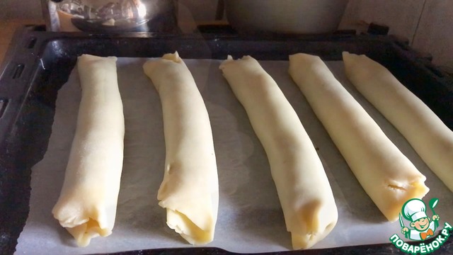 Скручиваем каждый пласт в рулет. Защипываем края. Выпекаем на пергаменте или силиконовом коврике при т. 180 град. 30 мин. до легкой румяной корочки (смотрите по своей духовке, времени может понадобиться больше или меньше)