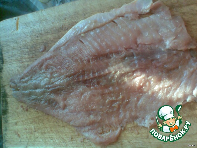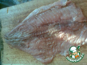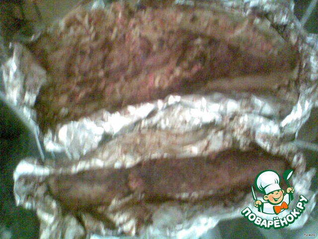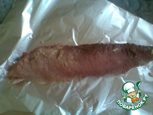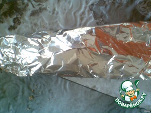• на фольгу выложить отбитую рыбку, на нее начинку и свернуть в рулет