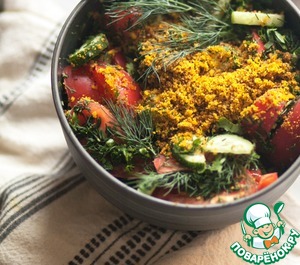 Грузинский салат с орехами и кахетинским маслом. Любимое в Грузии сочетание сочной зелени, спелых летних овощей и толченых орехов, сванской соли и кахетинского масла. Орехи, смешиваются с маслом и соком овощей, создавая густую, обволакивающую ореховую заправку. Этот салат неизменное блюдо на нашем столе и он просто не может надоесть.