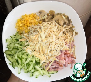 В салатник нарезать ветчину и огурец соломкой, с грибов и кукурузы слить воду и выложить в салатник. Также добавить нарезанные блины.