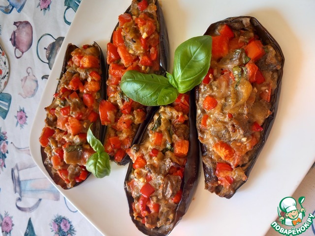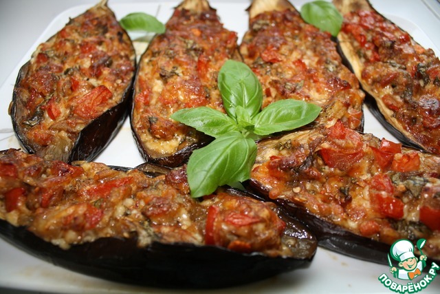 Заполнить баклажановые лодочки и запечь при темп.200 град еще 20 минут.