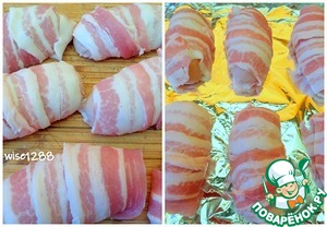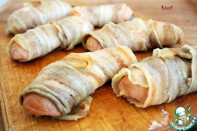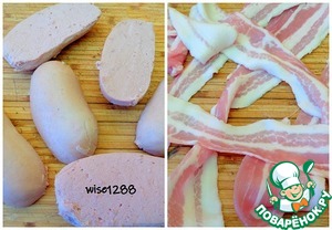 Сардельки разрезать пополам. Подготовить полоски бекона.